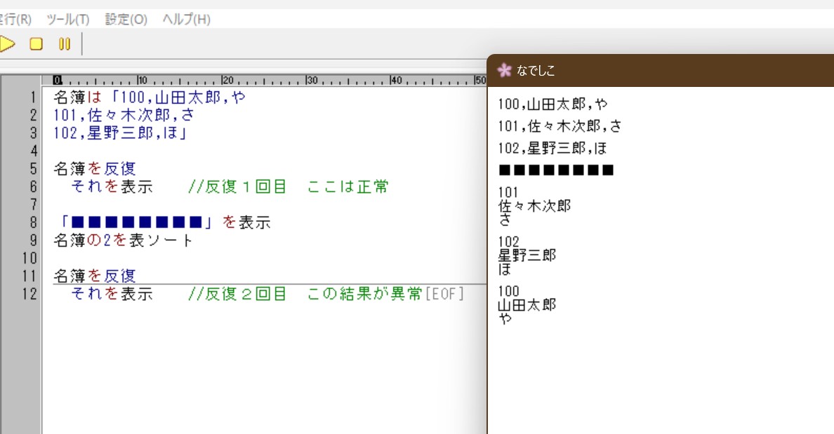 「表ソート」や「表数値ソート」を行うと、その後の「反復」の「それ」の結果が「,(コンマ)」が改行に置換されています